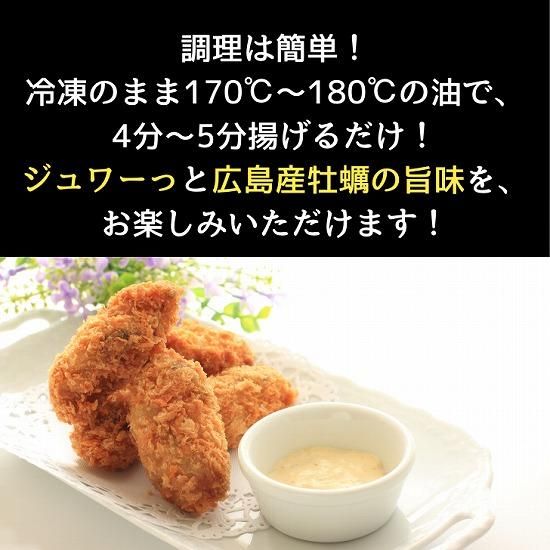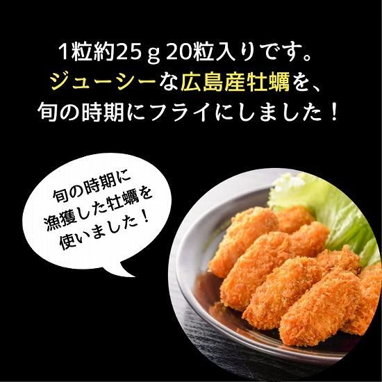 25gサイズのカキフライです。 凍ったまま170−180℃の油温で4分〜5分ほど揚げてください。 人気の広島産のカキフライです。 広島産メニューとして差別化ができます。 20個入りパックでご注文いただけます。