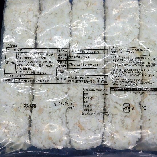 | 原材料、食品添加物 | えび、衣(パン粉、小麦粉、卵白粉、食塩、植物油脂、小麦たん白)、加工デンプン、増粘剤(グァーガム)、調味料(アミノ酸)、香辛料抽出物、貝Ca、膨張剤、(一部にえび、小麦、卵を含む) |