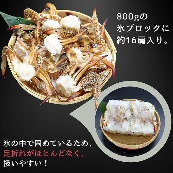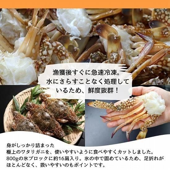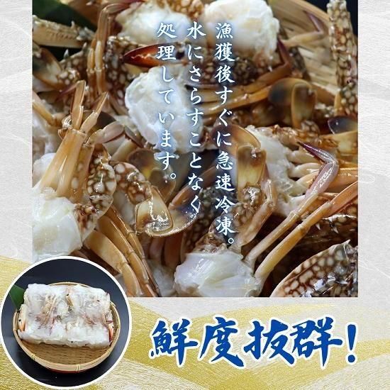 身入りも良く、鮮度抜群。漁獲後すぐに急速冷凍しているため、ワタリガニ本来の甘みと旨味を閉じ込めています。